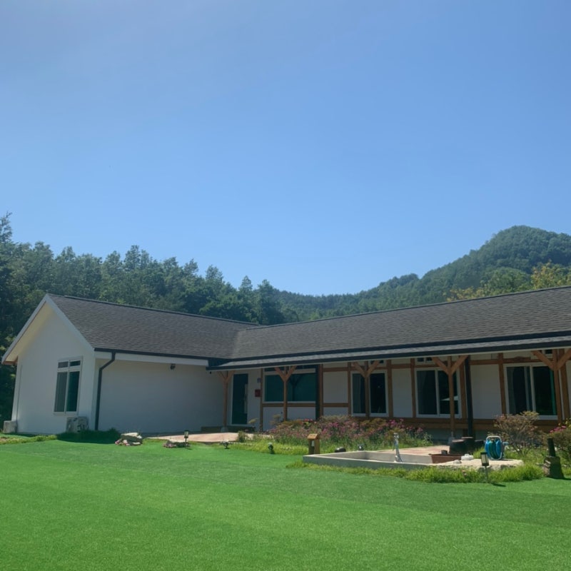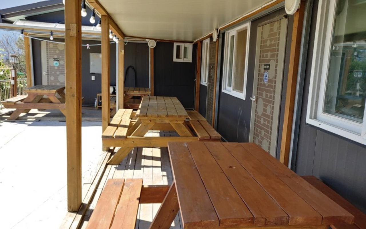 1층은 4인용 원룸이 2개, 2층은 4~5인용 원룸이 5개로 총 7개의 방이 있습니다 야외에는 접이식 식탁과 의자 그리고 바비큐 그릴이 있고 고기도 구워 드실 수 있습니다.(저희는 놀러간게 아니라 패스~!)